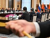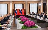 Рабочая поездка председателя правительства России Михаила Мишустина в Китай. Встреча глав правительств России и Китая на территории государственной резиденции "Сиху". Председатель правительства России Михаил Мишустин (в центре) во время встречи.