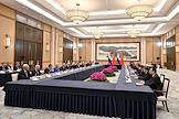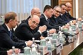 Рабочая поездка председателя правительства России Михаила Мишустина в Китай. Слева направо: первый заместитель председателя правительства России Денис Мантуров, председатель правительства России Михаил Мишустин и заместители председателя правительства России Дмитрий Чернышенко и Александр Новак во время встречи глав правительств России и Китая на территории государственной резиденции "Сиху".