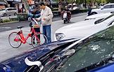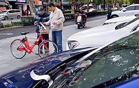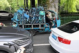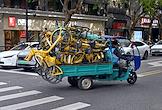 Виды Ханчжоу. Жанровая фотография. Мопед с прицепом, загруженным прокатными велосипедами.