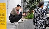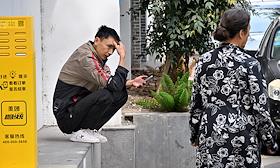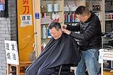 Виды Ханчжоу. Жанровая фотография. Парикмахер во время стрижки мужчины в уличном салоне.