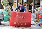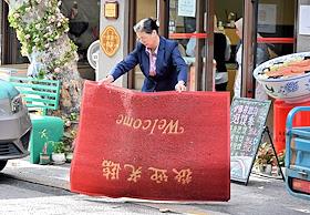 Виды Ханчжоу. Жанровая фотография. Женщина поправляет коврик перед входом в магазин с надписью Welcome.