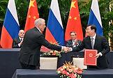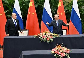 Рабочая поездка председателя правительства России Михаила Мишустина в Китай. Председатель правительства России Михаил Мишустин (слева) и премьер Государственного совета Китайской Народной Республики (КНР) Ли Цян (справа) во время церемонии подписания совместных документов по итогам встречи глав правительств России и Китая на территории государственной резиденции "Сиху".