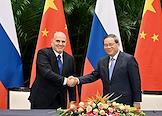 Рабочая поездка председателя правительства России Михаила Мишустина в Китай. Председатель правительства России Михаил Мишустин (слева) и премьер Государственного совета Китайской Народной Республики (КНР) Ли Цян во время церемонии подписания совместных документов по итогам встречи глав правительств России и Китая на территории государственной резиденции "Сиху".