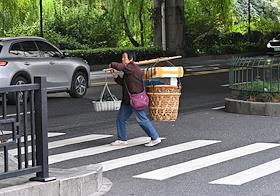 Виды Ханчжоу. Жанровая фотография. Мужчина с корзинами переходит улицу.