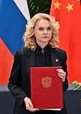 Рабочая поездка председателя правительства России Михаила Мишустина в Китай. Заместитель председателя правительства России Татьяна Голикова во время церемонии подписания совместных документов по итогам встречи глав правительств России и Китая на территории государственной резиденции "Сиху".