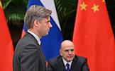 Рабочая поездка председателя правительства России Михаила Мишустина в Китай. Генеральный Директор госкорпорации "Роскосмос" Дмитрий Баканов (слева) во время церемонии подписания совместных документов по итогам встречи глав правительств России и Китая на территории государственной резиденции "Сиху".