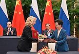 Рабочая поездка председателя правительства России Михаила Мишустина в Китай. Слева направо: председатель правительства России Михаил Мишустин, заместитель председателя правительства России Татьяна Голикова, премьер Государственного совета Китая Ли Цян и член Государственного совета КНР Шэнь Ицинь на церемонии подписания российско-китайских документов по итогам встречи глав правительств России и КНР на территории государственной резиденции "Сиху".