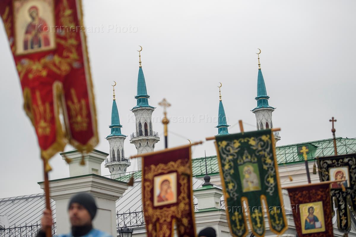 Крестный ход посвященном Дню Казанской иконы Божией Материи от Благовещенского собора до Крестовоздвиженской церкви. Священнослужитель во время службы в соборе Благовещения Пресвятой Богородицы.