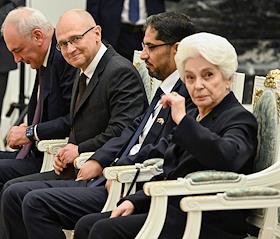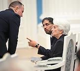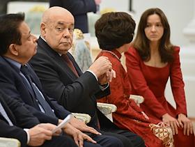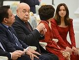 Церемония вручения государственных наград и премии президента России за вклад в укрепление единства российской нации в Екатерининском зале Сенатского дворца Кремля. Справа налево: президент Русского общественного фонда Александра Солженицына Наталья Солженицына, посол Объединённых Арабских Эмиратов в России Мухаммад Ахмад Султан Иса Аль-Джабер и заместитель руководителя администрации президента России Магомедсалам Магомедов перед началом церемонии.