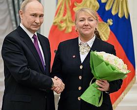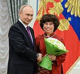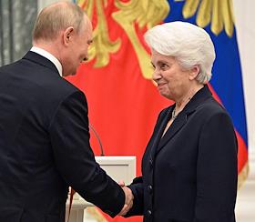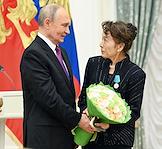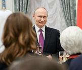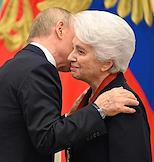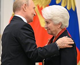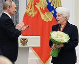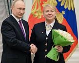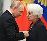 Церемония вручения государственных наград и премии президента России за вклад в укрепление единства российской нации в Екатерининском зале Сенатского дворца Кремля. Президент России Владимир Путин (слева) и генеральный директор Национального центра "Россия" Наталья Виртуозова (справа) во время церемонии.