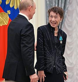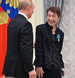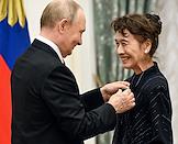 Церемония вручения государственных наград и премии президента России за вклад в укрепление единства российской нации в Екатерининском зале Сенатского дворца Кремля. Президент России Владимир Путин (слева) и председатель оргкомитета Фестиваля российской культуры в Японии, гражданка Японии, актриса Комаки Курихара (справа) во время церемонии.