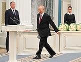 Церемония вручения государственных наград и премии президента России за вклад в укрепление единства российской нации в Екатерининском зале Сенатского дворца Кремля. Президент России Владимир Путин (справа) во время церемонии.