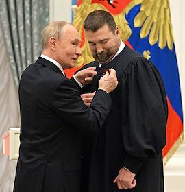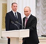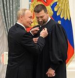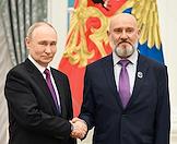 Церемония вручения государственных наград и премии президента России за вклад в укрепление единства российской нации в Екатерининском зале Сенатского дворца Кремля. Президент России Владимир Путин (слева) и заместитель директора по выставочной деятельности АНО "Дирекция выставки достижений "Россия" Павел Дорошенко (справа) во время церемонии.