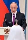 Церемония вручения государственных наград и премии президента России за вклад в укрепление единства российской нации в Екатерининском зале Сенатского дворца Кремля. Президент России Владимир Путин (слева) и патриарх Московский и Всея Руси Кирилл (справа) во время церемонии.