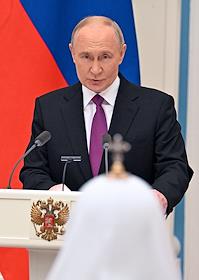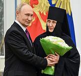 Церемония вручения государственных наград и премии президента России за вклад в укрепление единства российской нации в Екатерининском зале Сенатского дворца Кремля. Президент России Владимир Путин (слева) и настоятельница Свято-Рождество-Богородичного ставропигиального женского монастыря в городе Гродно Белорусского экзархата Московского патриархата, гражданка Белоруссии, игумения Гавриила (справа) во время церемонии.