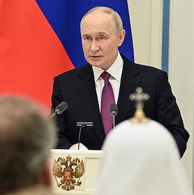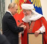 Церемония вручения государственных наград и премии президента России за вклад в укрепление единства российской нации в Екатерининском зале Сенатского дворца Кремля. Президент России Владимир Путин (в центре), митрополит Московский и всея Руси, предстоятель Русской православной старообрядческой церкви Корнилий (второй справа) и глава Российской и Ново-Нахичеванской епархии Армянской апостольской православной святой церкви, архиепископ Езрас (справа) после церемонии.