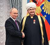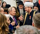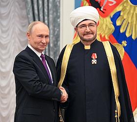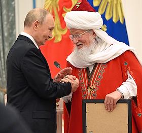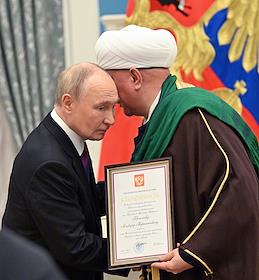 Церемония вручения государственных наград и премии президента России за вклад в укрепление единства российской нации в Екатерининском зале Сенатского дворца Кремля. Президент России Владимир Путин (слева) и глава Духовного собрания мусульман Российской Федерации, муфтий Альбир Крганов (справа) во время церемонии.