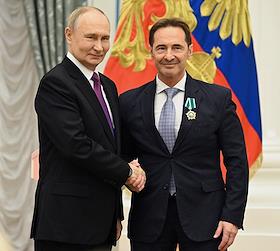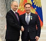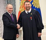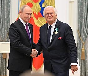 Церемония вручения государственных наград и премии президента России за вклад в укрепление единства российской нации в Екатерининском зале Сенатского дворца Кремля. Президент России Владимир Путин (слева) и пианист, дирижер, гражданин Германии Юстус Франц (справа) во время церемонии.