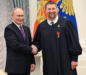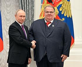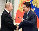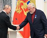 Церемония вручения государственных наград и премии президента России за вклад в укрепление единства российской нации в Екатерининском зале Сенатского дворца Кремля. Президент России Владимир Путин (слева) и первый заместитель председателя Евро-Азиатского отделения Генеральной конференции Церкви христиан – адвентистов седьмого дня Олег Гончаров (справа) во время церемонии.