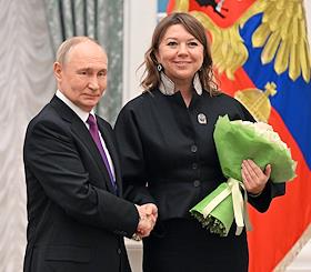 Церемония вручения государственных наград и премии президента России за вклад в укрепление единства российской нации в Екатерининском зале Сенатского дворца Кремля. Президент России Владимир Путин (слева) и заместитель директора ООО "Открытия", автор проекта "Большой этнографический диктант" Анна Габдуллина (справа) во время церемонии.
