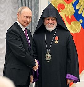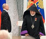 Церемония вручения государственных наград и премии президента России за вклад в укрепление единства российской нации в Екатерининском зале Сенатского дворца Кремля. Президент России Владимир Путин (слева) и глава Российской и Ново-Нахичеванской епархии Армянской апостольской православной святой церкви, архиепископ Езрас (справа) во время церемонии.