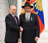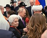 Церемония вручения государственных наград и премии президента России за вклад в укрепление единства российской нации в Екатерининском зале Сенатского дворца Кремля. Президент России Владимир Путин (слева), главный раввин Федерации еврейских общин России Берл Лазар (третий справа), председатель Духовного управления мусульман России, муфтий Равиль Гайнутдин (второй справа) и глава Российской и Ново-Нахичеванской епархии Армянской апостольской православной святой церкви, архиепископ Езрас (справа) после церемонии.