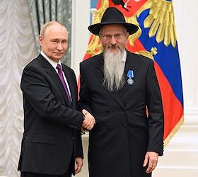 Церемония вручения государственных наград и премии президента России за вклад в укрепление единства российской нации в Екатерининском зале Сенатского дворца Кремля. Президент России Владимир Путин (слева) и главный раввин Федерации еврейских общин России Берл Лазар (справа) во время церемонии.
