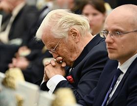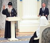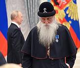 Церемония вручения государственных наград и премии президента России за вклад в укрепление единства российской нации в Екатерининском зале Сенатского дворца Кремля. Митрополит Московский и всея Руси, предстоятель Русской православной старообрядческой церкви Корнилий (слева) во время церемонии.