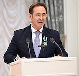 Церемония вручения государственных наград и премии президента России за вклад в укрепление единства российской нации в Екатерининском зале Сенатского дворца Кремля. Специальный представитель президента России по международному культурному сотрудничеству Михаил Швыдкой во время церемонии.
