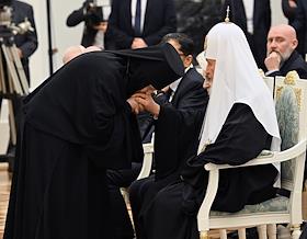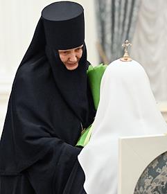 Церемония вручения государственных наград и премии президента России за вклад в укрепление единства российской нации в Екатерининском зале Сенатского дворца Кремля. Настоятельница Свято-Рождество-Богородичного ставропигиального женского монастыря в городе Гродно Белорусского экзархата Московского патриархата, гражданка Белоруссии, игумения Гавриила (слева) и патриарх Московский и Всея Руси Кирилл (справа) перед началом церемонии.