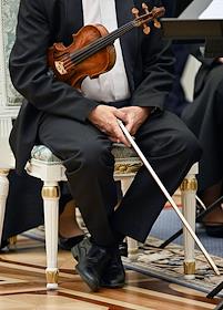 Церемония вручения государственных наград и премии президента России за вклад в укрепление единства российской нации в Екатерининском зале Сенатского дворца Кремля. Жанровая фотография. Музыкант оркестра перед началом церемонии.