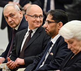 Церемония вручения государственных наград и премии президента России за вклад в укрепление единства российской нации в Екатерининском зале Сенатского дворца Кремля. Справа налево: президент Русского общественного фонда Александра Солженицына Наталья Солженицына, посол Объединённых Арабских Эмиратов в России Мухаммад Ахмад Султан Иса Аль-Джабер, первый заместитель главы администрации президента России Сергей Кириенко и заместитель руководителя администрации президента России Магомедсалам Магомедов перед началом церемонии.