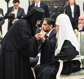 Церемония вручения государственных наград и премии президента России за вклад в укрепление единства российской нации в Екатерининском зале Сенатского дворца Кремля. Глава Российской и Ново-Нахичеванской епархии Армянской апостольской православной святой церкви, архиепископ Езрас во время церемонии.