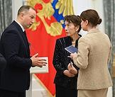Церемония вручения государственных наград и премии президента России за вклад в укрепление единства российской нации в Екатерининском зале Сенатского дворца Кремля. Председатель оргкомитета Фестиваля российской культуры в Японии, гражданка Японии Комаки Курихара (в центре) перед началом церемонии.