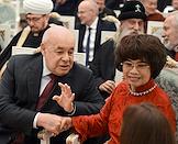 Церемония вручения государственных наград и премии президента России за вклад в укрепление единства российской нации в Екатерининском зале Сенатского дворца Кремля. Президент Русского общественного фонда Александра Солженицына Наталья Солженицына (справа) и посол Объединённых Арабских Эмиратов в России Мухаммад Ахмад Султан Иса Аль-Джабер (в центре) перед началом церемонии.
