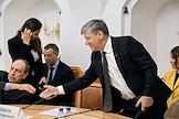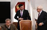 Расширенное заседание Экспертного Совета при комитете Государственной думы (ГД) России по международным делам на тему: "Трансатлантическое давление на Россию: ближайшие перспективы и пределы эскалации" в ГД России. Первые заместители председателя комитета ГД России по международным делам Вячеслав Никонов (слева), Дмитрий Новиков (справа) и заместитель министра иностранных дел России Сергей Рябков (в центре) во время заседания.