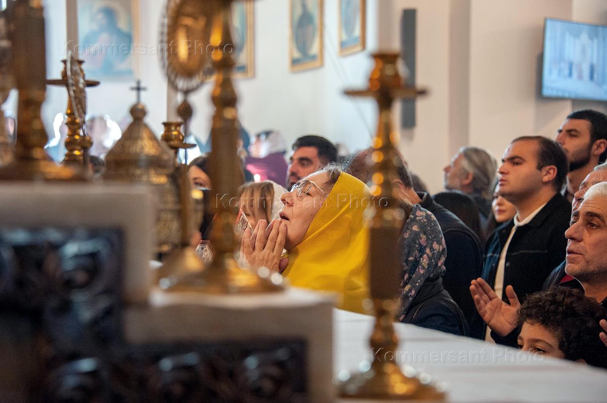 Патриарший молебен по случаю двадцатишестилетия посвящения в сан и интронизации Католикоса всех армян Гарегина II в Ереване. Верующие во время богослужения.