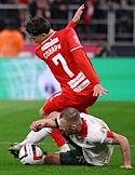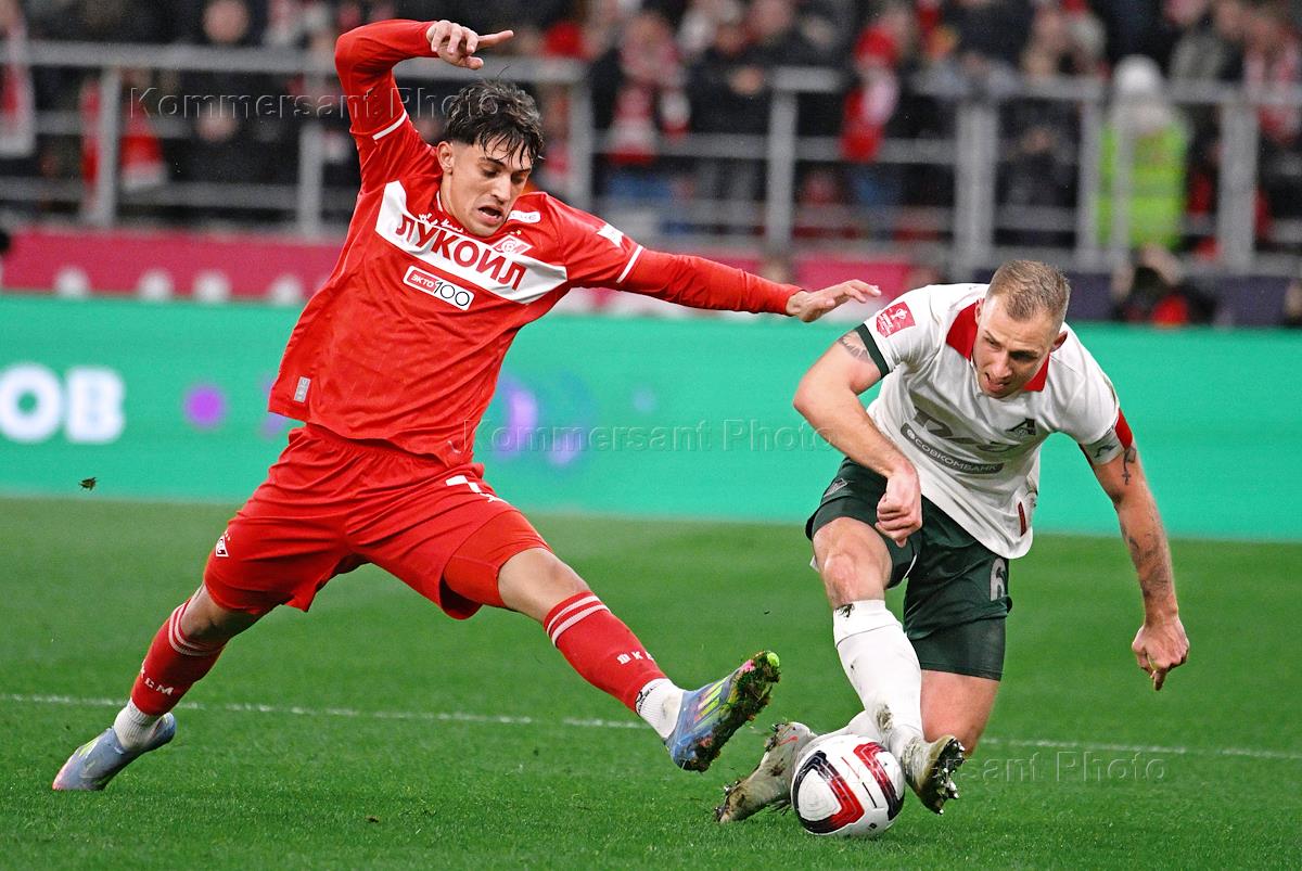 Фонбет - Кубок России по футболу 2025/26. 1/4 финала. Матч между командами "Спартак" (Москва) - "Локомотив" (Москва) на стадионе "Лукойл Арена". Игрок команды "Спартак" Наиль Умяров (слева) и игрок команды "Локомотив" Данил Пруцев (справа) во время матча.