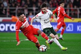 Фонбет - Кубок России по футболу 2025/26. 1/4 финала. Матч между командами "Спартак" (Москва) - "Локомотив" (Москва) на стадионе "Лукойл Арена". Игрок команды "Локомотив" Данил Пруцев (слева) во время матча.
