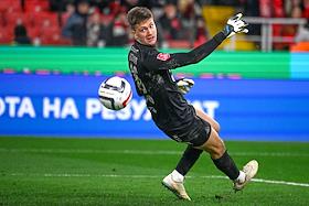 Фонбет - Кубок России по футболу 2025/26. 1/4 финала. Матч между командами "Спартак" (Москва) - "Локомотив" (Москва) на стадионе "Лукойл Арена". Вратарь команды "Спартак" Илья Помазун во время матча.