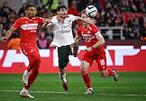 Фонбет - Кубок России по футболу 2025/26. 1/4 финала. Матч между командами "Спартак" (Москва) - "Локомотив" (Москва) на стадионе "Лукойл Арена". Игроки команды "Спартак" Александер Джику (слева), Наиль Умяров (справа) и игрок команды "Локомотив" Зелимхан Бакаев (в центре) во время матча.