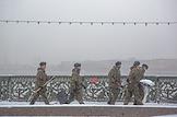 Виды Санкт-Петербурга. Жанровая фотография. Военнослужащие с лопатами идут по мосту во время снегопада.