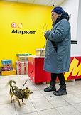 Виды Санкт-Петербурга. Жанровая фотография. Пожилая женщина с собакой в пункте выдачи заказов (ПВЗ) маркетплейса "Яндекс маркет".