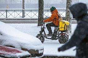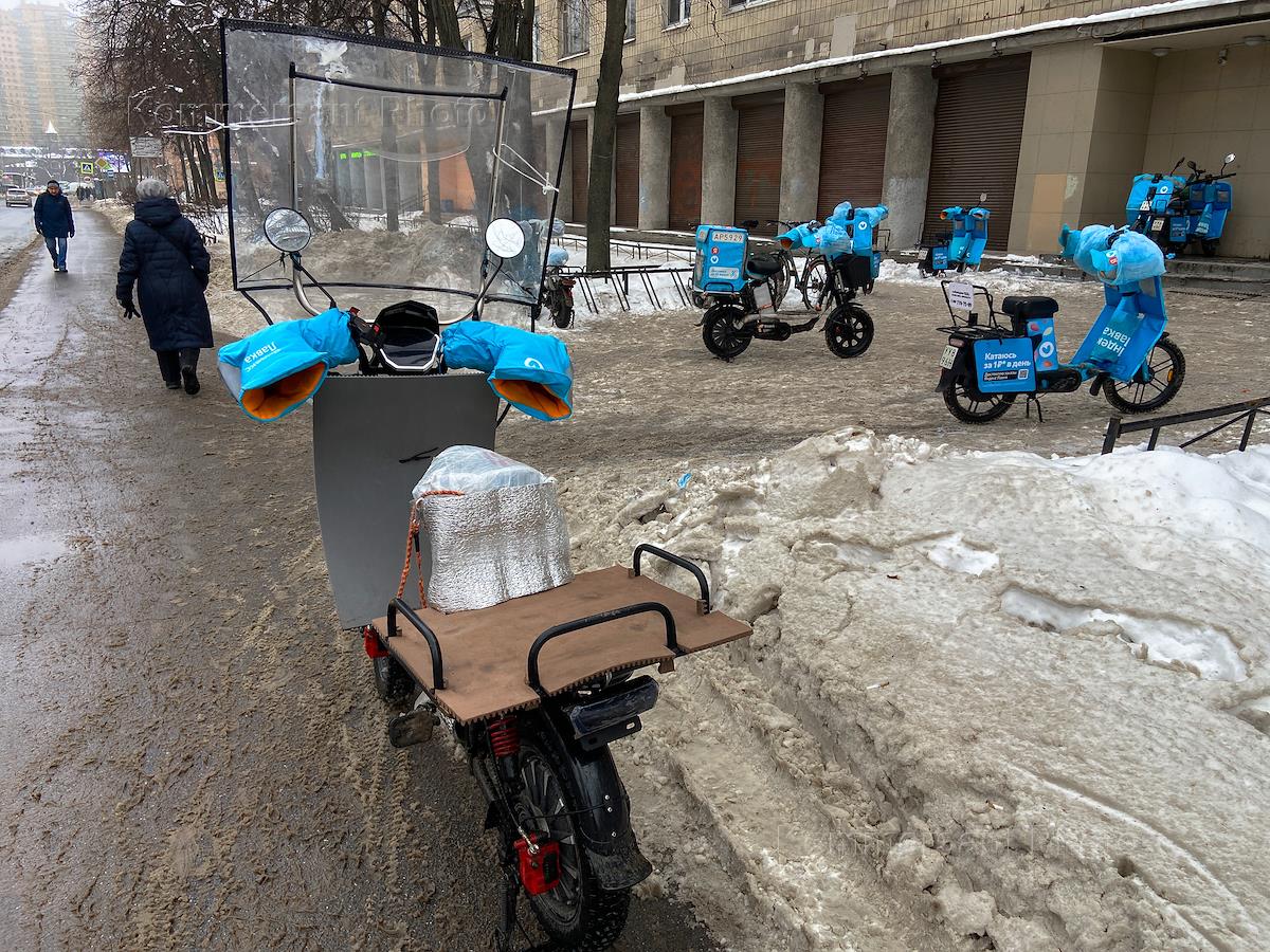 Виды Санкт-Петербурга. Жанровая фотография. Курьер службы доставки "Яндекс Еда" на велосипеде во время снегопада.