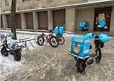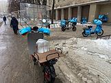Виды Санкт-Петербурга. Жанровая фотография. Электровелосипеды курьеров компании "Яндекс Лавка" на специализированной парковке.