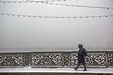 Виды Санкт-Петербурга. Жанровая фотография. Мужчина идет по мосту во время снегопада.