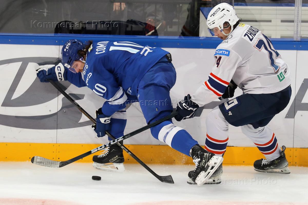 Континентальная Хоккейная Лига (КХЛ). Матч между командами "Динамо" (Москва) - "Лада" (Тольятти) на стадионе "ВТБ Арена". Игрок команды "Динамо" Макс Комтуа (слева) и игрок команды "Лада" Кирилл Жуков (справа) во время матча.