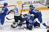 Континентальная Хоккейная Лига (КХЛ). Матч между командами "Динамо" (Москва) - "Лада" (Тольятти) на стадионе "ВТБ Арена". Вратарь команды "Лада" Иван Бочаров (слева) во время матча.
