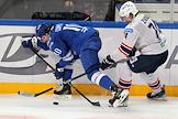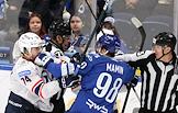Континентальная Хоккейная Лига (КХЛ). Матч между командами "Динамо" (Москва) - "Лада" (Тольятти) на стадионе "ВТБ Арена". Игрок команды "Динамо" Максим Мамин (в центре) и игрок команды "Лада" Кирилл Жуков (слева) во время матча.