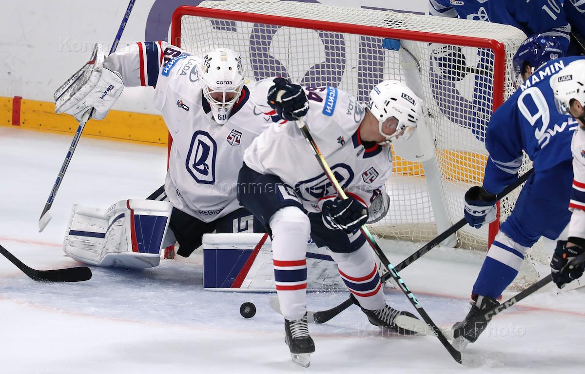 Континентальная Хоккейная Лига (КХЛ). Матч между командами "Динамо" (Москва) - "Лада" (Тольятти) на стадионе "ВТБ Арена". Вратарь команды "Динамо" Даниил Пыленков (слева) во время матча.